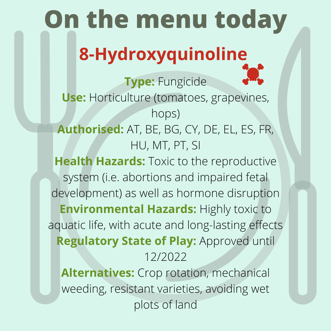The Commission’s proposal will be discussed with Member States on 2 and 3 October. More discussions and possibly a vote will take place in late 2024 or the beginning of 2025. Meanwhile, the current approval period of the substance will be extended. Since 2021, 8-hydroxyquinoline is on PAN Europe's list of Toxic12 pesticides to be banned immediately.