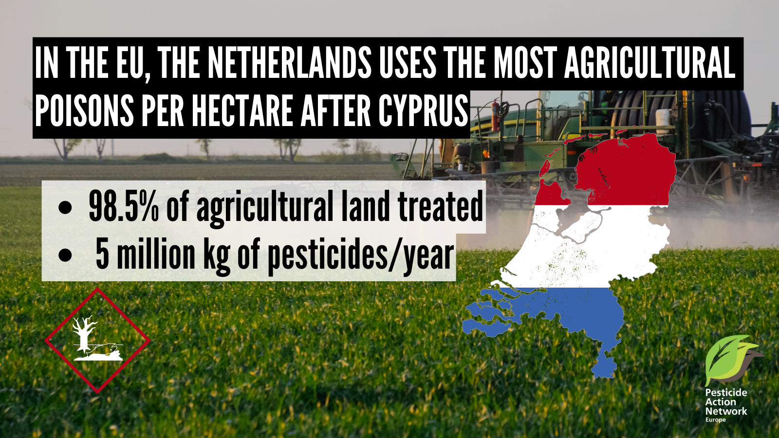 Of all European countries, the Netherlands uses the most agricultural poisons per hectare (apart from Cyprus). A total of 98.5% of agricultural land is treated with 5 million kg of pesticides every year. Many pesticides, such as insecticides or the controversial Glyphosate, kill aquatic and soil life, insects, destroy biodiversity and are linked to cancer and Parkinson's disease. More than a hundred pesticides are found everywhere due to frequent use. In soil and air, in our food, in ground and surface water, in urine, poo and even in hoovers.