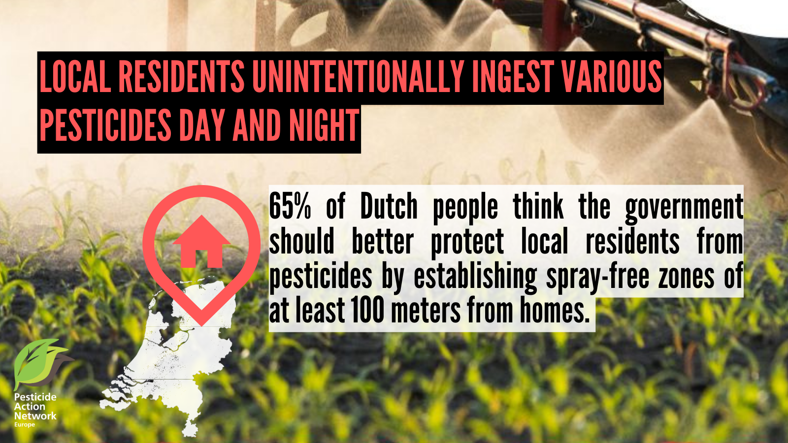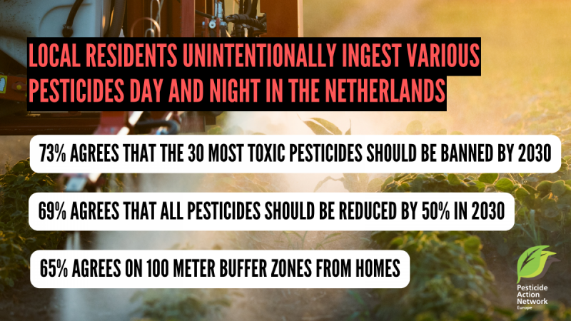 A new opinion poll shows that 70% of Dutch people think that pesticide use should be reduced by 50% by 2030. The same survey shows that 73% of Dutch people think the 30 most toxic pesticides should be banned by 2030. Also, 65% think the government should better protect local residents from pesticides by establishing spray-free buffer zones of at least 100 metres from homes.