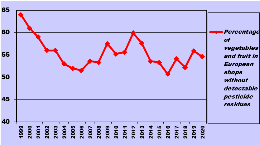 - In 2020, close to half of the fruit and vegetables consumed in the EU was polluted with one or more pesticide residues. The percentage of vegetables and fruit in European shops without detectable (below analytical detection limit) pesticide residues went slightly down to 54,6%, reinforcing the trend of recent years towards higher and higher levels of pesticide residues.