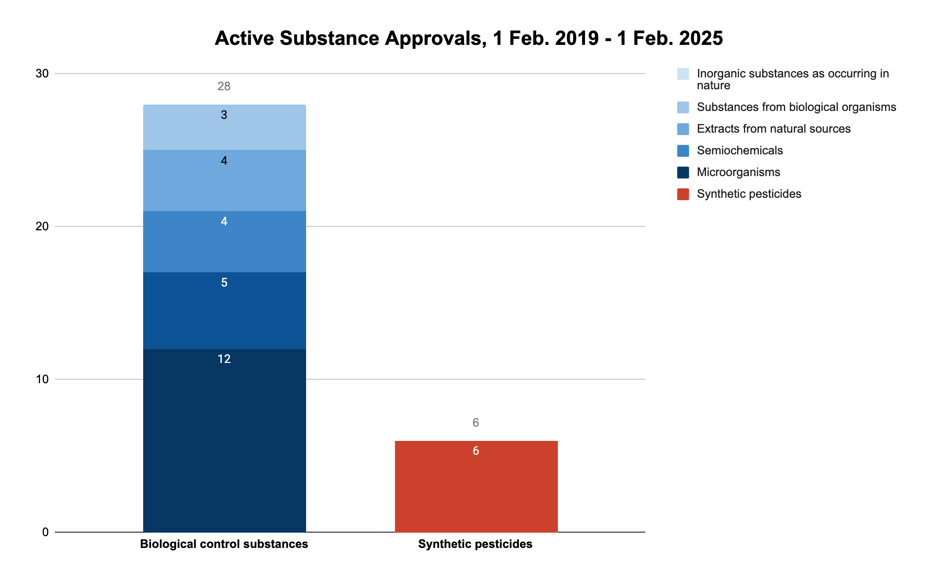 According to the latest updates of the European Commission, between 1 February 2019 to 1 February 2025, about 82% of approved active substances were biocontrol agents, of which almost half were microorganisms (see graph below), compared to 18% of synthetic pesticides.
