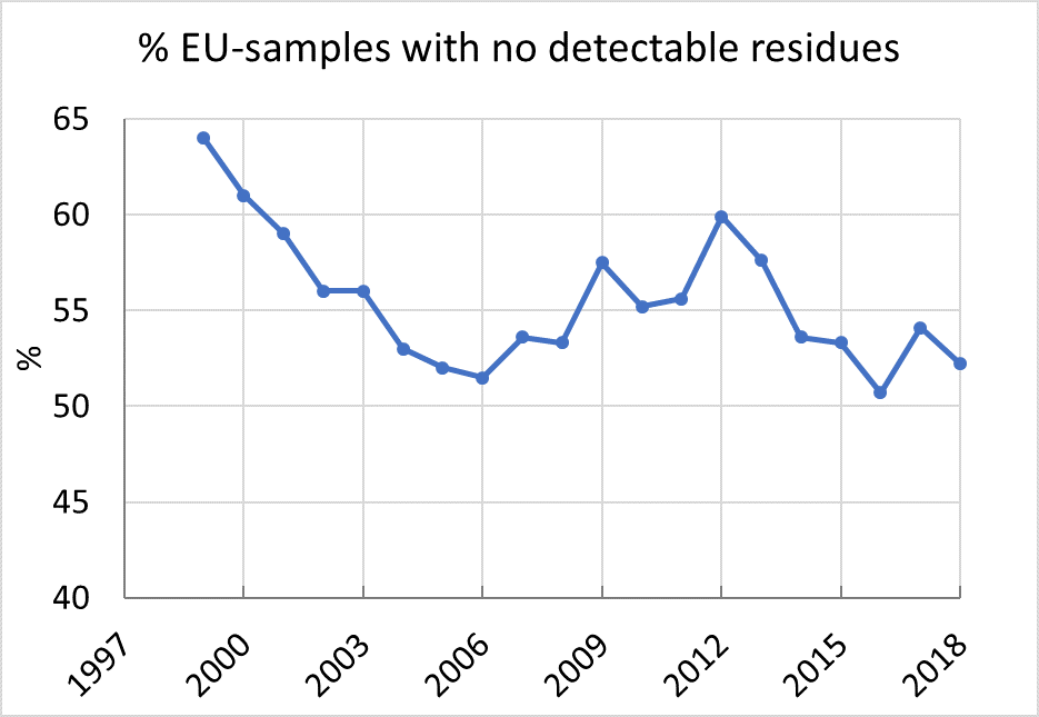 Figure 1. In 2018 the percentage of vegetables and fruit in European shops without detectable pesticide residues (below analytical detection limit) decreased to 52.2%. Close to half of the total fruit and vegetables are contaminated with one or more pesticide residues.
