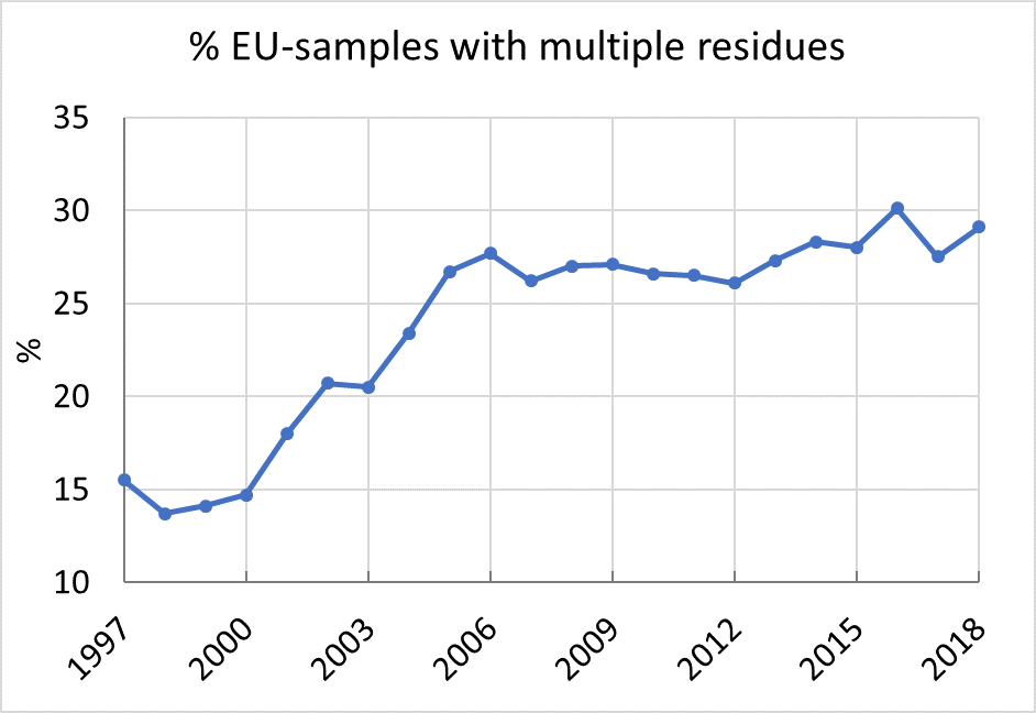 Figure 2. In 2018 the percentage of multiple residues in vegetables and fruit consumed in Europe increased to a higher rate of 29.1 %
