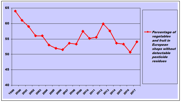 Figure 1. In 2017 the percentage of vegetables and fruit in European shops without detectable pesticide residues (below analytical detection limit) went slightly up to 54,1% (2014 levels), after the very bad 2016 outcome.