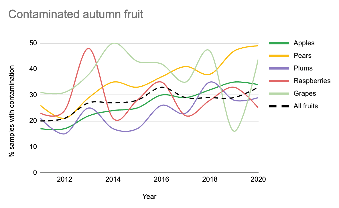 Autumn fruit is highly contaminated with the most hazardous category of pesticides, the latest government data shows. High rates of European pears (49%), table grapes (44%), apples (34%), plums (29%) and raspberries (25%) were sold with residues of pesticides linked to increased risk of cancer, birth deformities, heart disease and other serious conditions and/or toxic to the environment, the latest data shows [1]. Most are a threat even at very low doses. The problem has been getting worse. PAN Europe analysed 44,137 fresh fruit samples tested by governments from 2011 to 2020 and found that contamination of apples, pears and plums has nearly doubled since 2011.