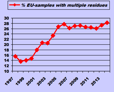 Up to 28% of all fruit and vegetable products on the markets contains more than one pesticide (see Figure, EFSA data); for grapes and strawberries 15 different pesticides in one sample is not uncommon.